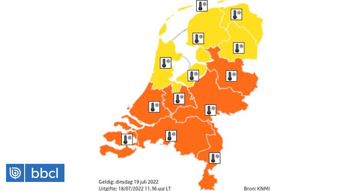 Morgen, dinsdag 19 juli, wordt het zeer warm. In het midden en zuiden van het land geldt van de ochtend tot in de avond #codeoranje voor zeer hoge temperaturen, met maximumtemperaturen van 38-39°C. #knmiwaarschuwing pic.twitter.com/xEz01odR21