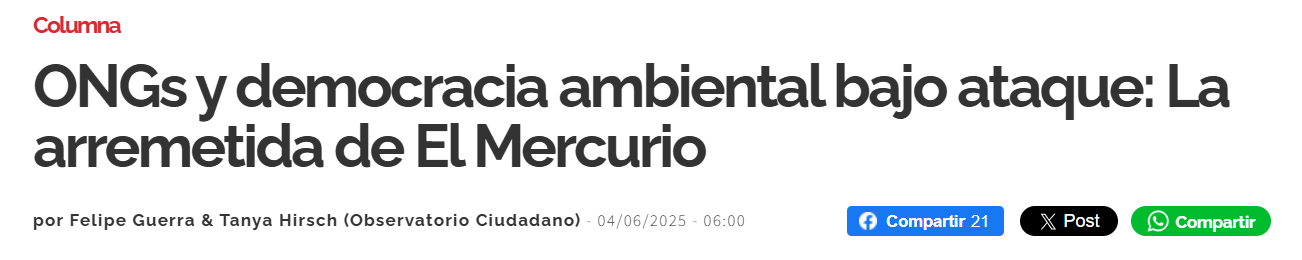 El 12 de agosto de 2019, el Observatorio Ciudadano subió una publicación a sus redes sociales. Hacía alusión a una columna de opinión titulada “La machi que defiende el río”.