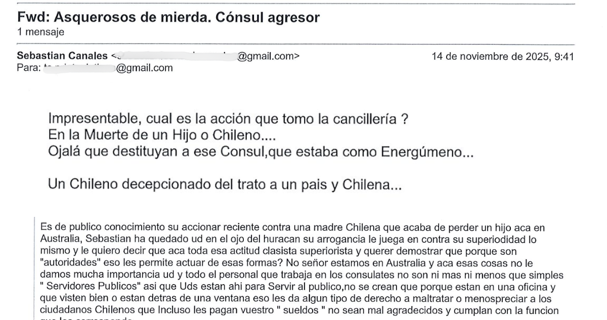 “No se crean que porque están en una oficina y que visten bien o están detrás de una ventana, eso les da algún tipo de derecho a maltratar o menospreciar a los ciudadanos chilenos que incluso les pagan vuestro sueldos. No sean malagradecidos”, fue otro correo que llegó a la casilla del consulado.