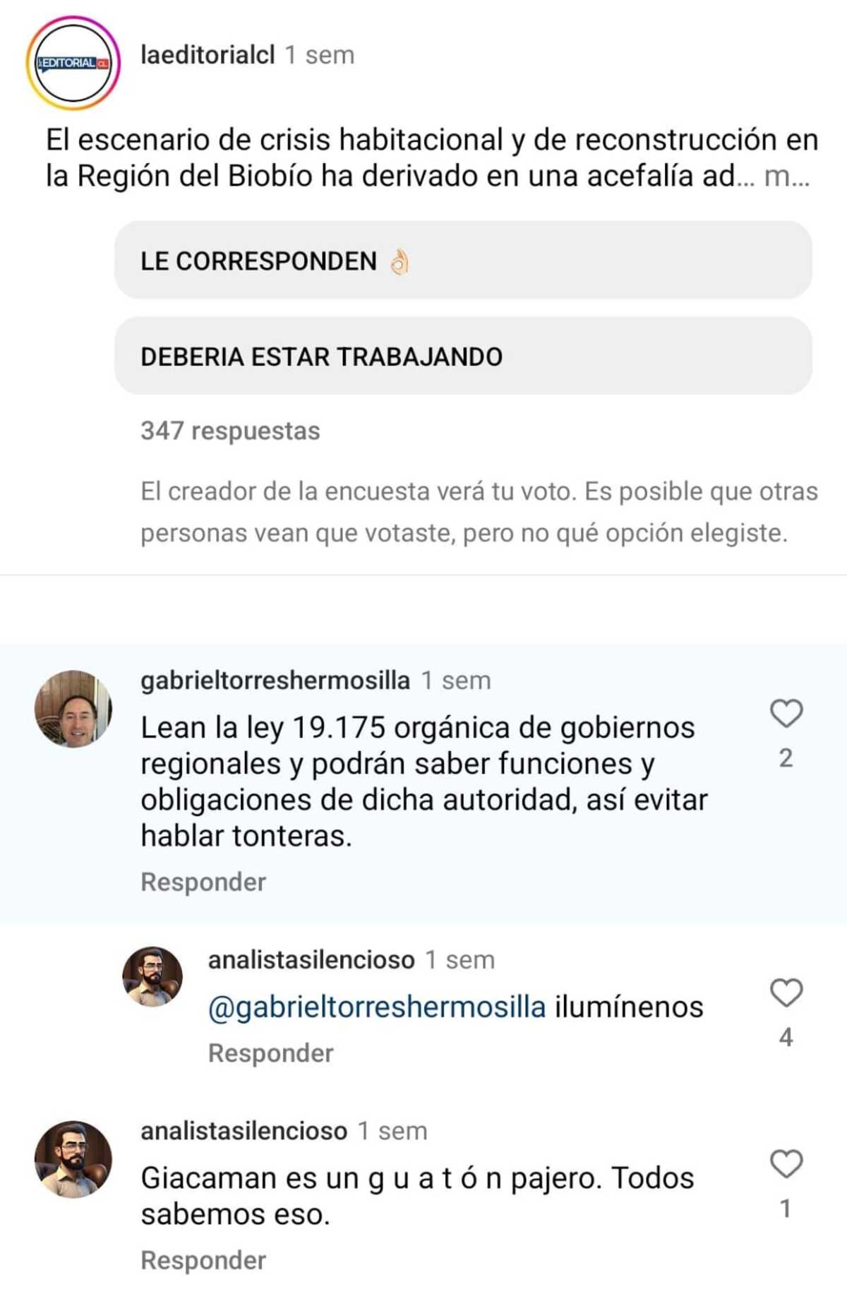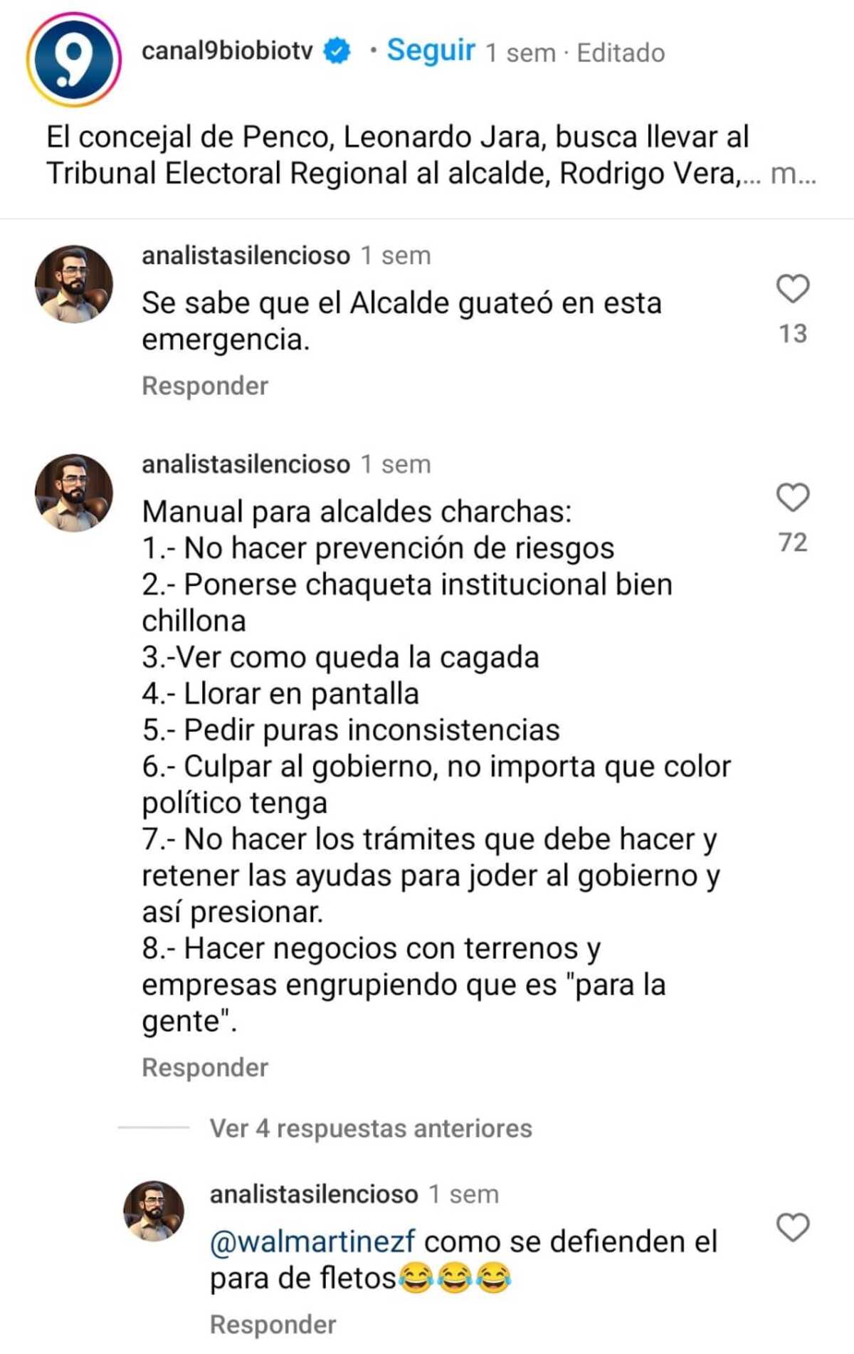 En otra publicación del mismo canal de televisión, en donde hacía referencia a las acciones legales que anunció un concejal en contra del alcalde de Penco por abandono de deberes, @analistasilencioso comentó que “se sabe que el alcalde guateó en esta emergencia”. En respuesta a un comentario que lo contradecía, trató de “facho marica” al usuario.