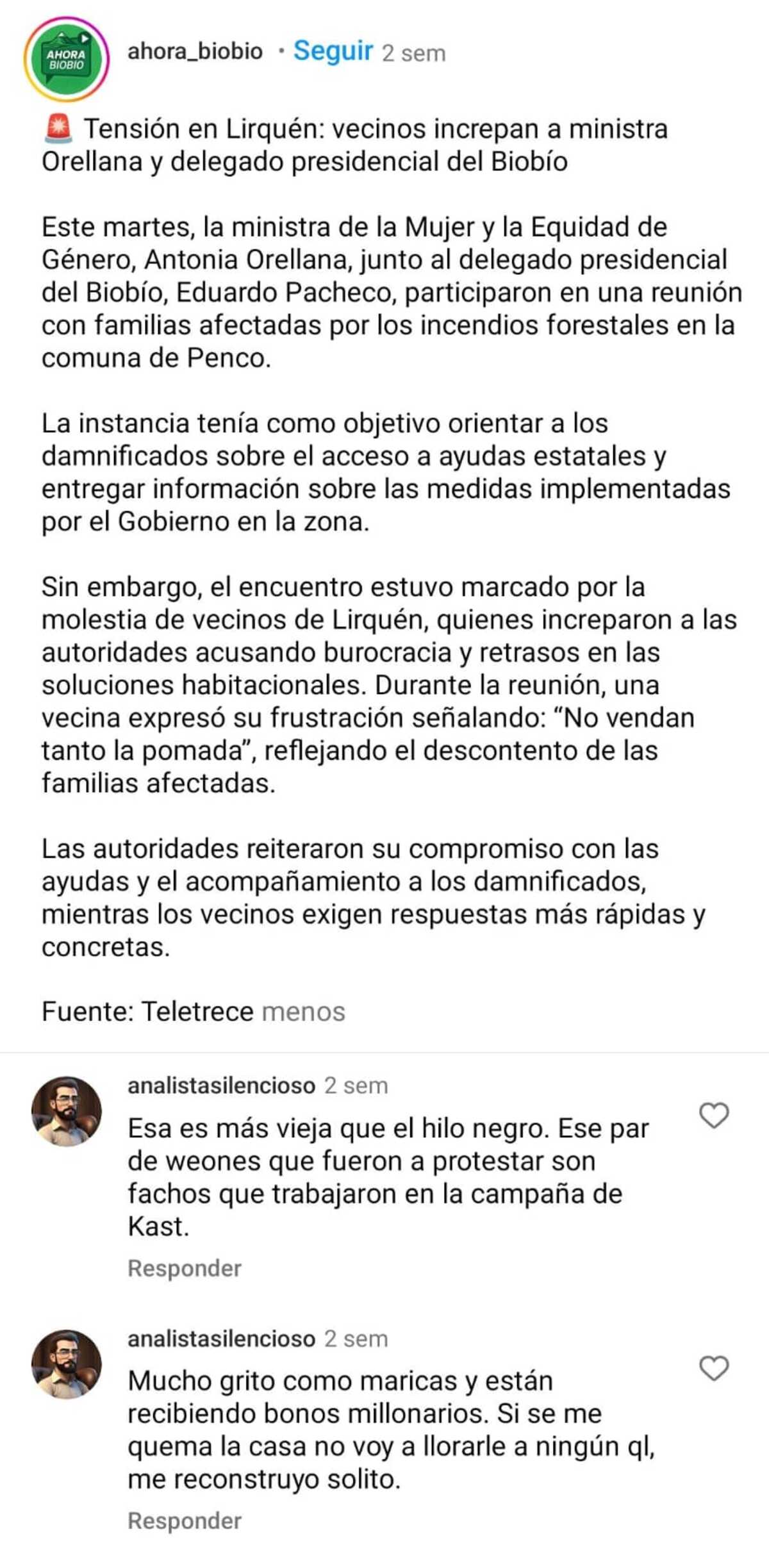 La página de Instagram @Ahora_BioBio publicó un video de lo ocurrido, titulando “Tensión en Lirquén”. Como venía siendo de costumbre, los comentarios a favor de las autoridades y en contra de los damnificados no demoraron.