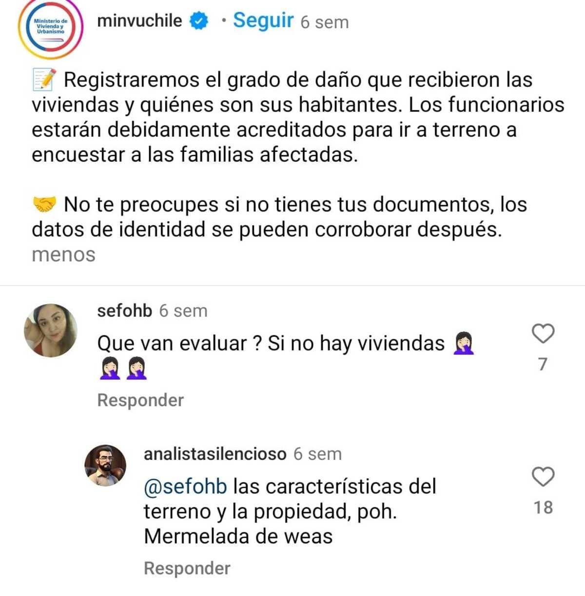 En ese post una usuaria preguntó “qué van a evaluar? Si no hay vivienda”. ¿El primero en responder? El analista silencioso: “Las características del terreno y la propiedad, poh. Mermelada de weas”.