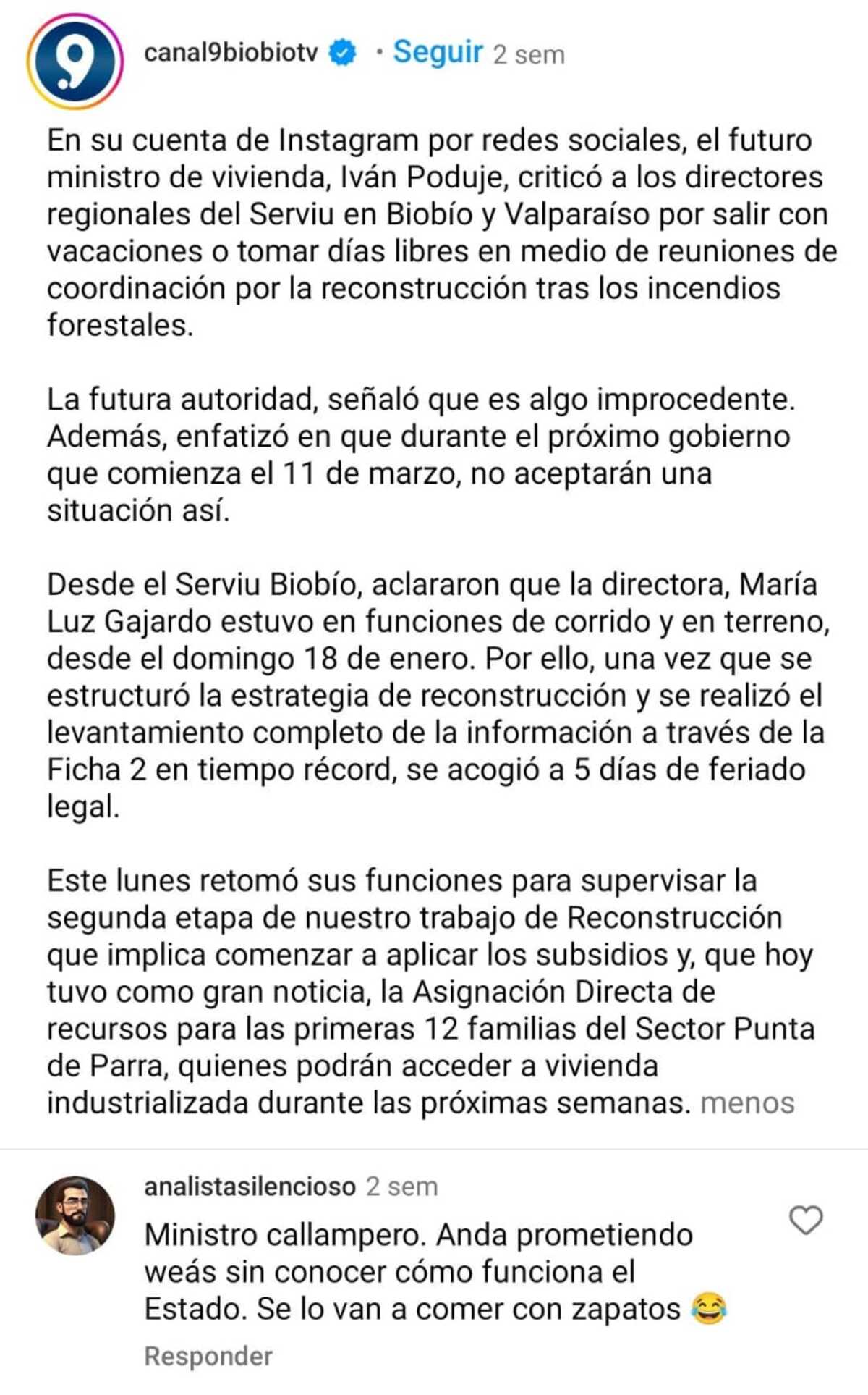Así, en otro post @Canal9BioBioTV le dedicó palabras al futuro ministro de Vivienda y Urbanismo. El post hacía alusión a las críticas de Iván Poduje a la directora del Serviu Bío Bío por las vacaciones, lo que —evidentemente— desató la furia del Analista Silencioso.