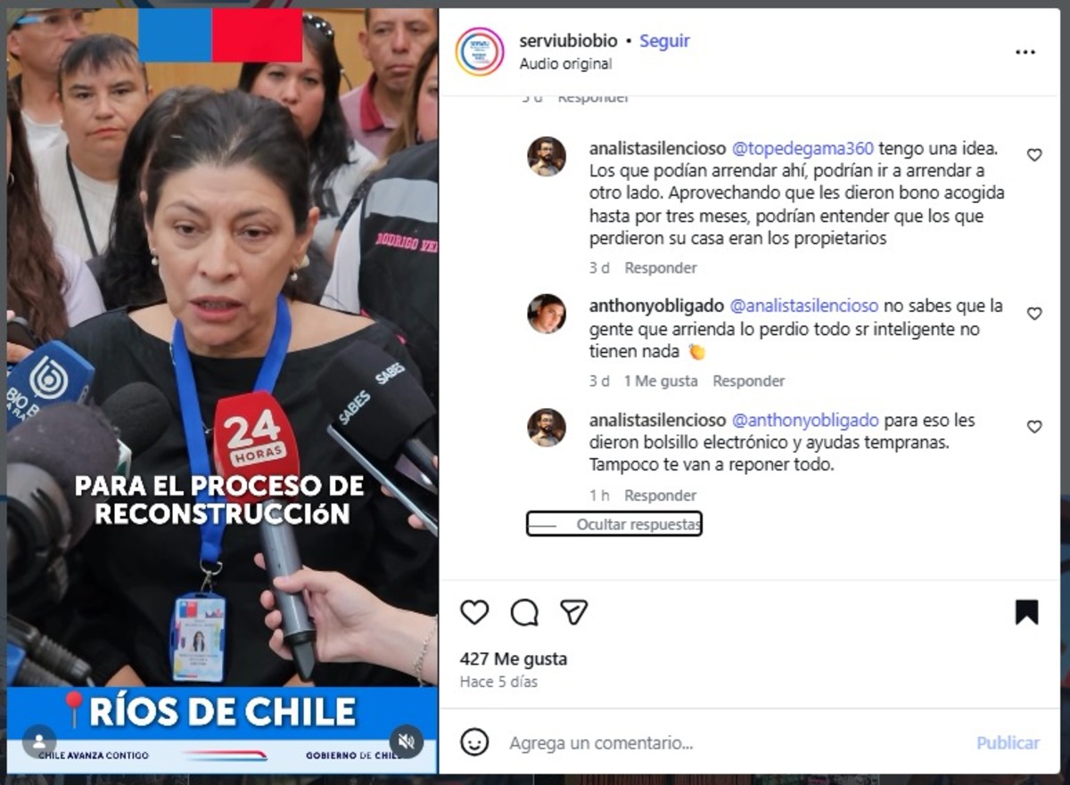 En medio de la catástrofe por los incendios forestales y el drama de miles de familias que perdieron sus viviendas, las publicaciones de la cuenta oficial de Instagram del Servicio de Vivienda y Urbanización (Serviu) de la región del Bío Bío (@ServiuBioBio), comenzaron a llenarse de comentarios negativos. Y es que mucha gente utilizó ese medio para descargar la frustración propia de no tener un techo donde vivir o para buscar respuestas de las autoridades. Pero lo que encontraron, lejos de información concreta, fue hostilidad, ironía y trato denigrante.