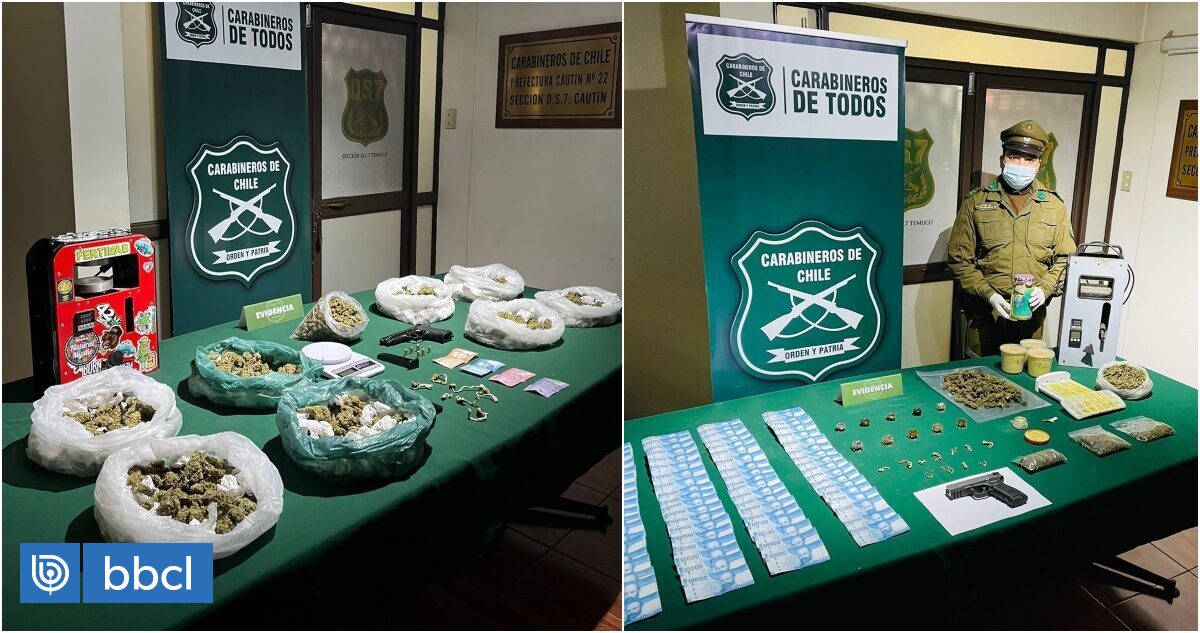 Carabineros del OS7 detuvo a dos hombres e incautó más de 3 kilos de marihuana, hongos alucinógenos y leche de cannabis sativa en Freire y Villarrica, en la región de La Araucanía.