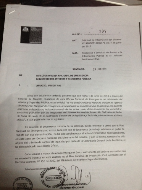 “En relación al documento materia de su solicitud, puedo informar a usted que el Plan Nacional de Emergencia no existe, toda vez que el documento de trabajo existe en poder de ONEMI, con esa denominación, no ha sido aprobado por el acto administrativo correspondiente, en este caso por Decreto Supremo del Ministerio del Interior, y por lo mismo, tampoco ha sido objeto del trámite de control de legalidad por parte de la Contraloría General de la República, ni ha sido publicado en el diario oficial” dice el documento firmado por Toro.