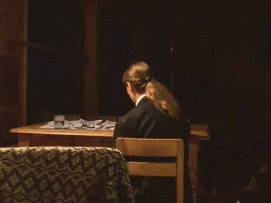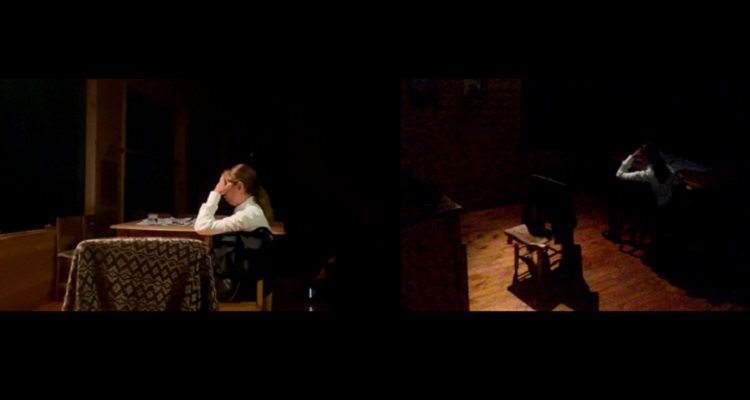 A la imagen de la gran quijada con que se inicia el unipersonal, le sigue un espacio amplio en donde un par de mesas y sillas dibujan el ambiente por donde se moverá Claudia di Girolamo, mostrado por una cámara frontal y otra lateral con la actriz, vestida formalmente como hombre, traje y camisa que le quedan grandes.