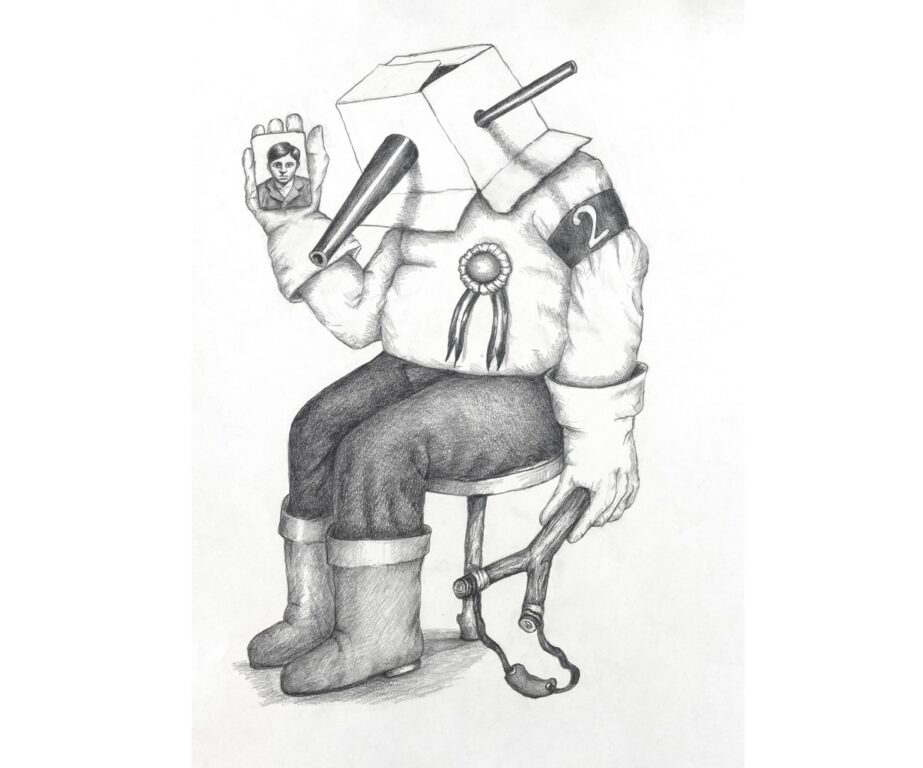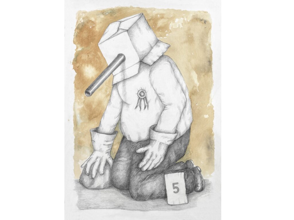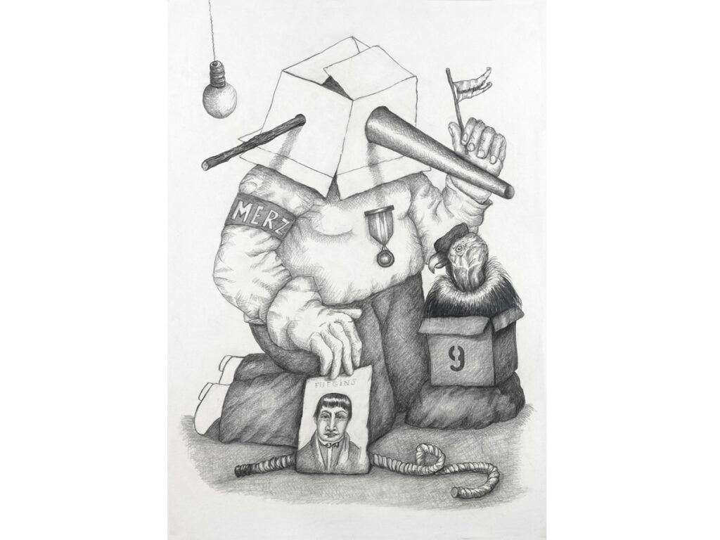 A primera vista, se advierte la economía de recursos con lápiz grafito sobre papel blanco, sin cromatismos. Esta aparente sencillez “golpea” con una maquinaria narrativa: adultez e infantilidad escolar atrapadas en cubículos (castigadas), máscaras escolares de burro y cartones que recubren rostros atrapados, o escondidos en sus propios uniformes de sus propios estancamientos y porvenires conceptuales en las lecciones desconocidas de lo “contemporáneo”. Cada imagen es una performance detenida, donde el gesto del maestro deviene sátira y el estudiante enmascarado se convierte en su propia revolución nunca acabada. La técnica del grafito se pliega en superficies alusivas -uniformes raídos, pizarras agrietadas, escenarios de aula desmontados- para agredir la seriedad alegórica del enclaustramiento académico.