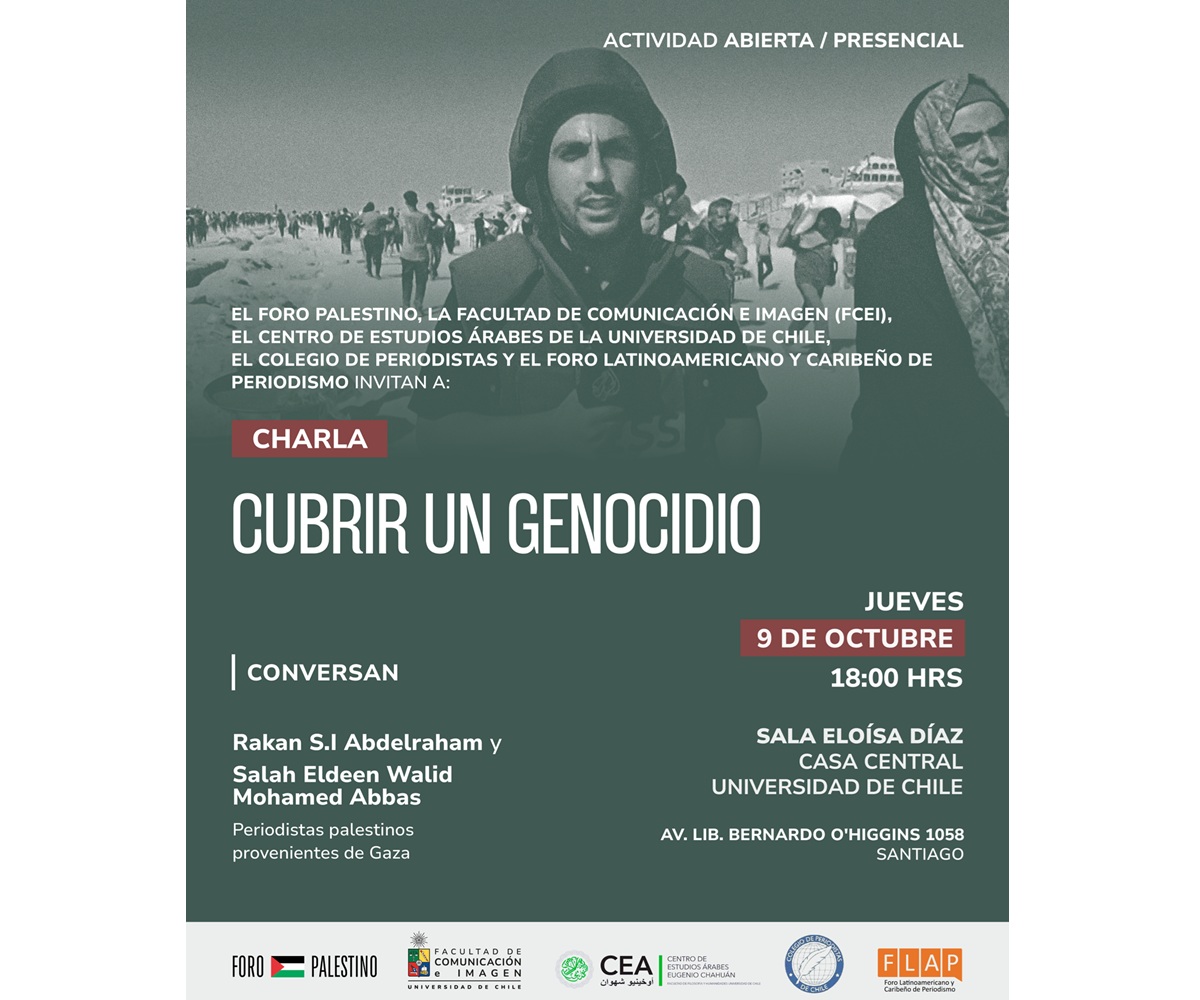 Convocan: Foro Palestino, Facultad de Comunicación e Imagen (FCEI) y Centro de Estudios Árabes Eugenio Chahuán de la Universidad de Chile, Colegio de Periodistas y Foro Latinoamericano y Caribeño de Periodistas.