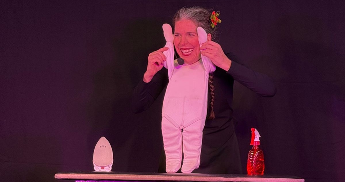 El lenguaje del gesto la acompaña cuando representa a una mamá que vive situaciones cotidianas, asociadas a la crianza de los hijos. Y cómo escapa del peso del cansancio y la rutina jugando y creando con los pañales personajes e historias entretenidas.
