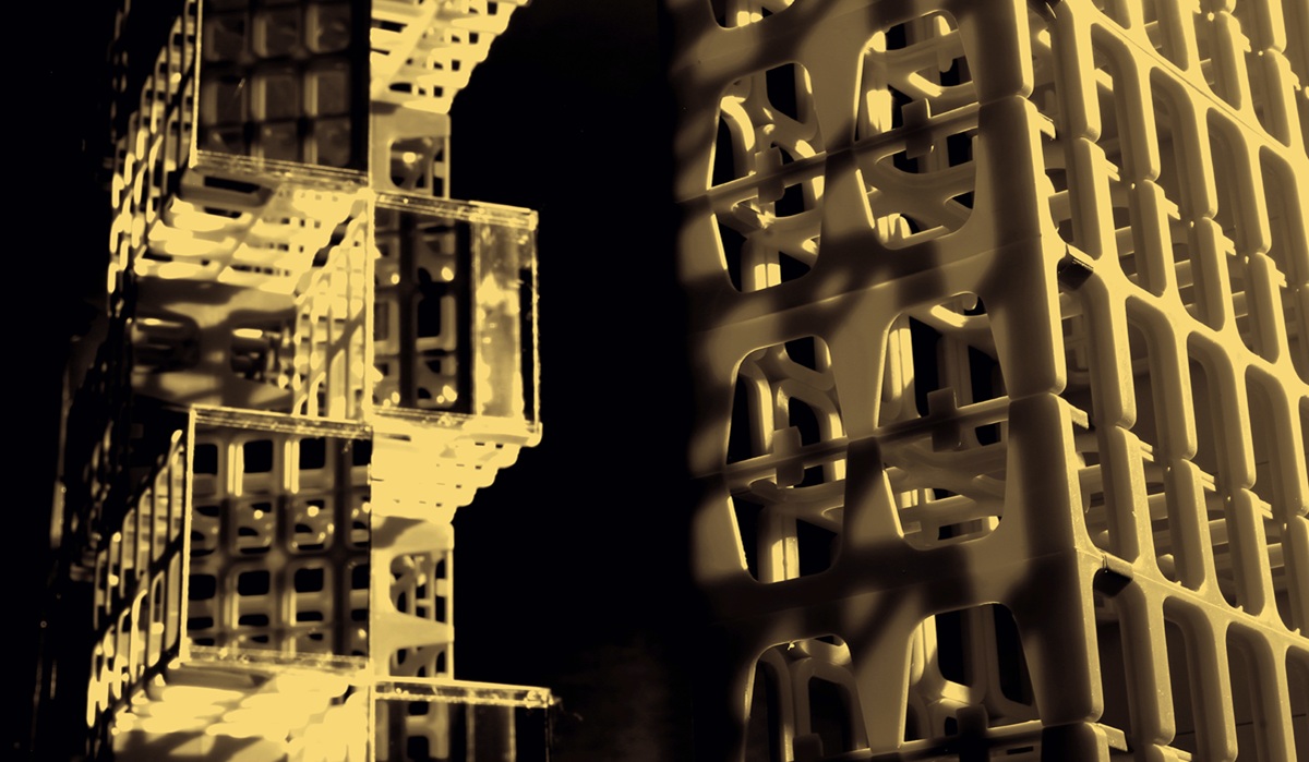 Pero, ¿qué significa que la arquitectura ficticia surja del desecho? Aquí podría encontrarse el nudo crítico de la muestra. Si la arquitectura moderna chilena (la de la CORVI, la de la Unidad Popular, la del desarrollismo) fue un proyecto de “habitar un territorio a partir de las decisiones de un grupo”, estas nuevas micro-arquitecturas son el resultado del habitar el consumismo. Son los restos fósiles del capitalismo tardío resignificados como monumentos. Al aplicar una luz dramática y un encuadre que elimina la referencia de escala,Portus monumentaliza estos deshechos. Así, un trozo de embalaje se convierte en un edificio brutalista, una botella plástica cortada, en una cúpula geodésica al estilo arquitectónico de Fuller.