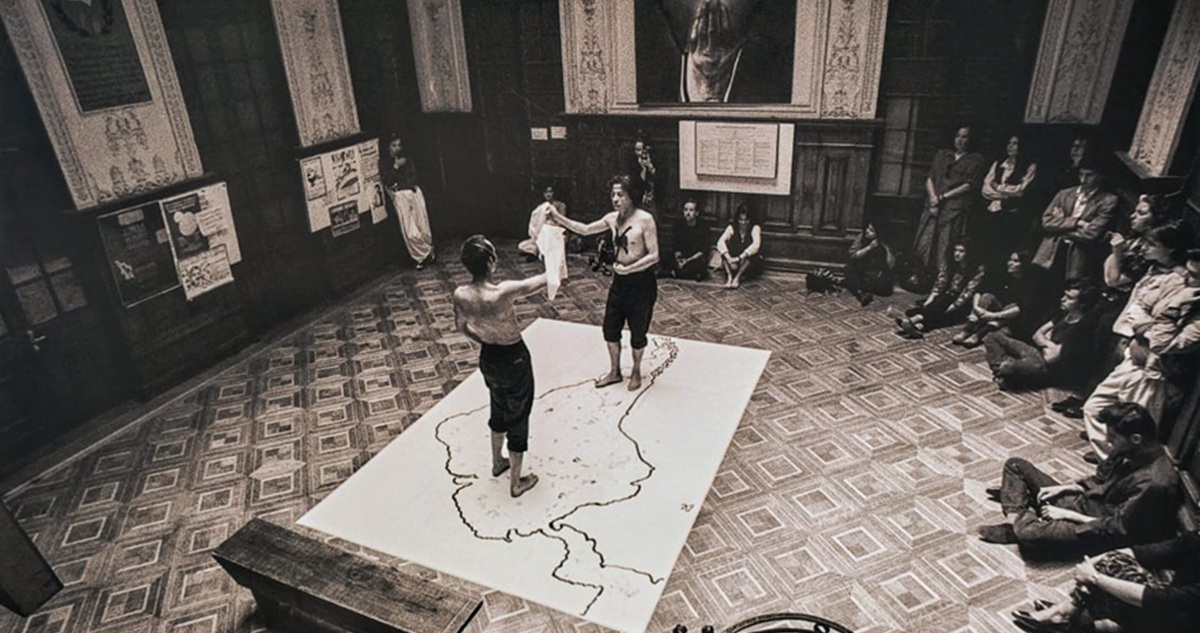 “No te puedo explicar una obra, no soy guía de turismo. Pero, por ejemplo, esto que está acá, ni siquiera me acuerdo quién es el fotógrafo. Fue una de las primeras performances que hicimos con Pedro Lemebel. No había visto esta foto, que se llama ‘Que no muera el amor bajo los puentes’.