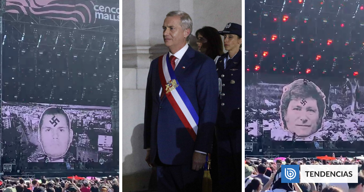 Tal como pudo atestiguar BioBioChile en el lugar, fue durante la presentación de la agrupación este sábado que el conjunto plasmó en sus visuales a Claudio Crespo, Carabinero que disparó y dejó ciego a Gustavo Gatica durante las manifestaciones del Estallido Social, al Presidente argentino Javier Milei y al mandatario nacional.