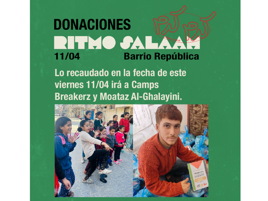 Este viernes 11 de abril se llevará a cabo Ritmo Salaam 3, una fiesta solidaria y de recaudación para Gaza, organizada por el colectivo Karam Karam. El evento, que destaca la cultura y música palestina/árabe, busca generar consciencia y activar la solidaridad. Contará con artistas como Lorelei, Dilunar y SONDA, quienes incluirán un toque árabe en su presentación. Habrá sorpresas, venta de material solidario y una performance de * Bait of Yamal *. Las entradas se adquieren a través de PortalDisc y los fondos recaudados beneficiarán a Campsbreakerz y Moataz Al-Ghalayini en Gaza.