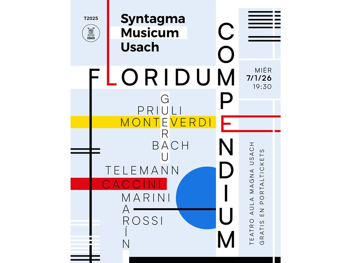 Syntagma Musicum Usach cerrará su temporada 2025 con el concierto "Floridum Compendium" el miércoles 7 de enero a las 19:30 horas en el Teatro Aula Magna Usach. El evento gratuito presentará obras de compositores europeos y latinoamericanos, incluyendo extractos de las Variaciones Goldberg de Bach y piezas de las compositoras Marieta Morosina Priuli y Francesca Caccini. La agrupación, con 47 años de trayectoria, ofrecerá un collage de lo mejor de su temporada, destacando su diversidad musical.