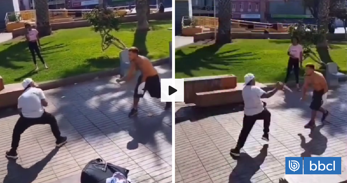 En el video que se ha viralizado durante las últimas horas, se puede ver a dos individuos, uno vestido con una polera blanca y un pantalón negro, quien además portaba un arma blanca de gran envergadura, y el otro quien sin polera y usando solo un short negro se vale de una cuchilla más pequeña.