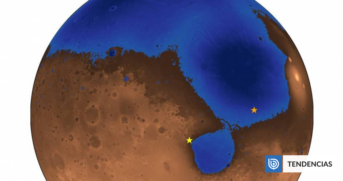 *Una recreación hipotética de Marte hace unos 3.600 millones de años, con el océano Deuteronilus cubriendo casi la mitad del planeta. La estrella naranja muestra la localización del rover chino Zhurong. La estrella amarilla corresponde al rover de la NASA Perseverance. | Robert Citron