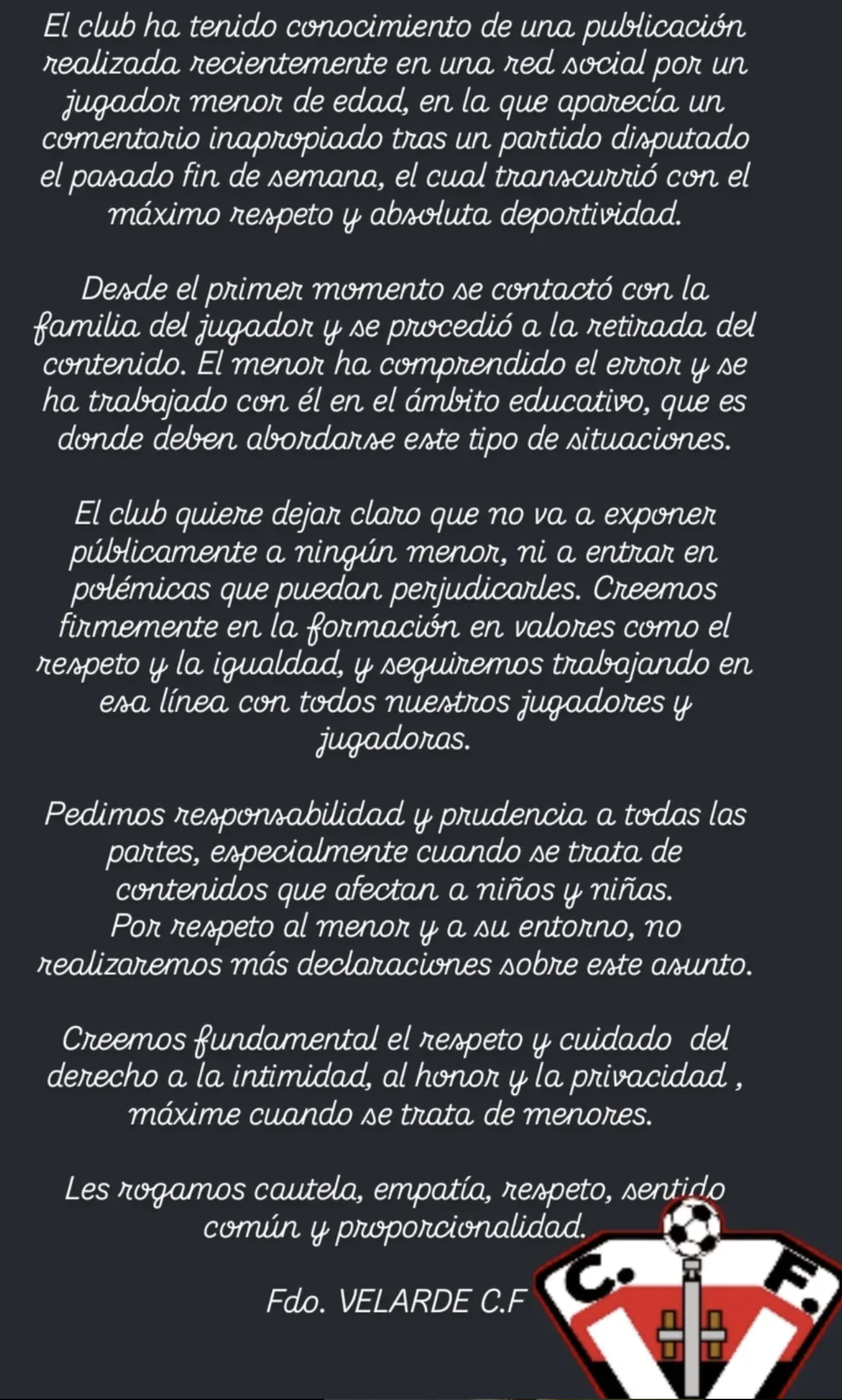 La respuesta del Velarde FC no se ha hecho esperar. Ante la polémica, el club ha decidido tomar medidas y anunció que llevará a cabo una “charla formativa dirigida a todos los futbolistas del club” con el objetivo de sensibilizar sobre temas cruciales como “la igualdad y el respeto en el deporte” y “el impacto de las redes sociales en su día a día”.