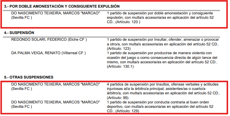 El informe arbitral de Alejandro Muñiz Ruiz, arbitro del encuentro, establece que “una vez expulsado el jugador del Sevilla FC. N°23 Marcos Do Nascimiento Teixeira, se encaró hacia mi persona a escasa distancia de mi cara de forma intimidante teniendo que ser retirado por sus compañeros. Cuando fue separado se dirigió a mí en los siguientes términos: “Fillo da puta madre”, dirigiéndose al túnel de vestuario donde propinó una patada a un balón que había en la zona el cuarto árbitro”. Sentenció.