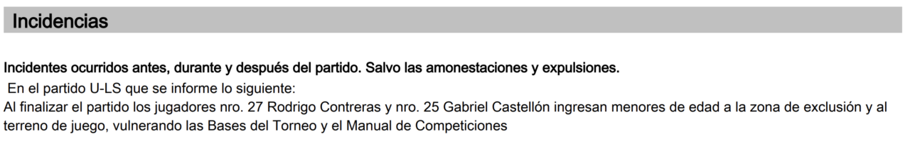 “Al finalizar el partido, los jugadores nro. 27 Rodrigo Contreras y nro. 25 Gabriel Castellón ingresan menores de edad a la zona de exclusión y al terreno de juego, vulnerando las Bases del Torneo y el Manual de Competiciones“, escribió el colegiado.