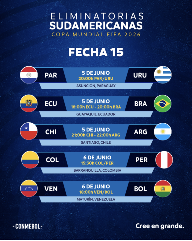 La Conmebol oficializó este viernes la programación para las fechas 15 y 16 de las Eliminatorias Sudamericanas para la Copa del Mundo de EE.UU., México y Canadá 2026.