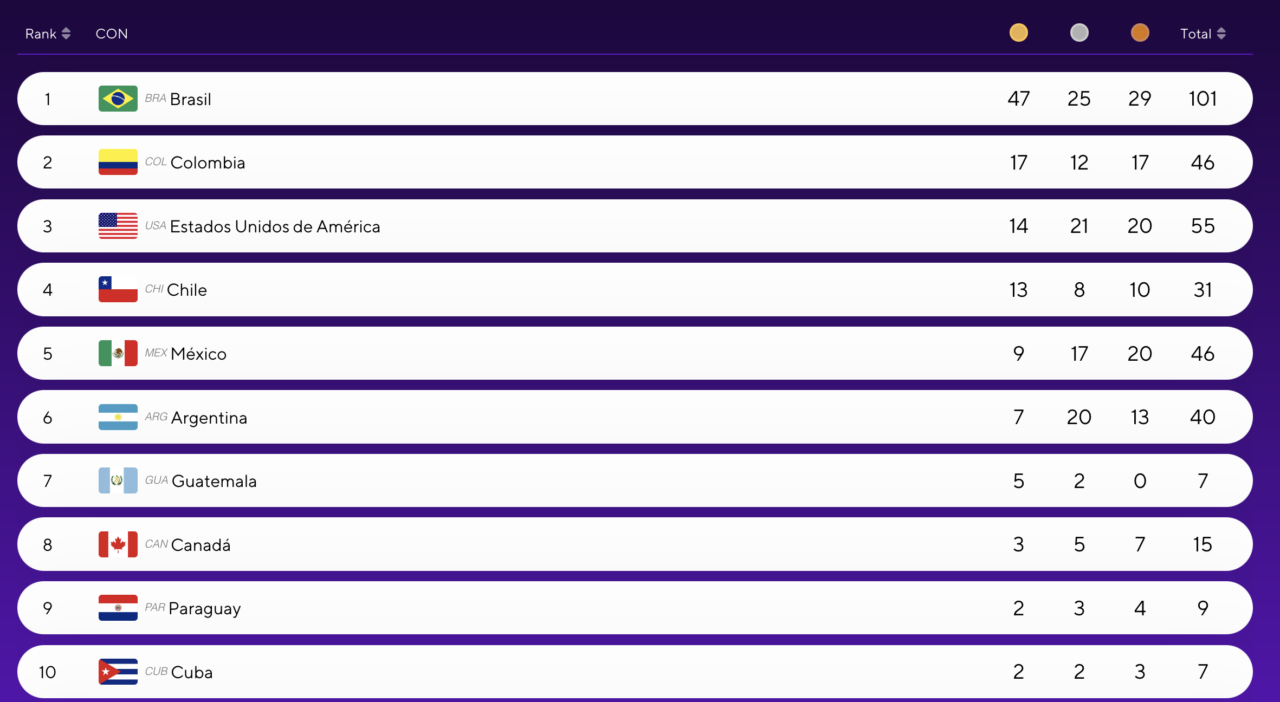 El Team Chile suma 31 preseas (13 oros, 8 platas y 10 bronces), colocándose en el cuarto lugar del medallero después de Brasil (47 oros), Colombia (17) y EE.UU. (14).