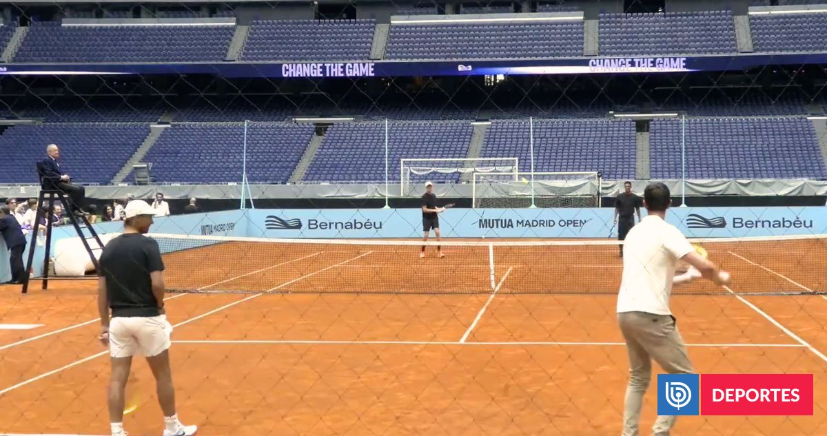 Rafael Nadal, Jude Bellingham, Thibaut Courtois y Jannik Sinner disfrutaron de un peloteo en la pista de tierra batida del estadio Santiago Bernabéu con motivo del Masters 1000 de Madrid. La instalación de la pista forma parte de la versatilidad del estadio, que ahora alberga esta novedosa atracción. Florentino Pérez, presidente del Real Madrid, fue el juez de silla en este evento, donde también participó el hijo de Nadal.