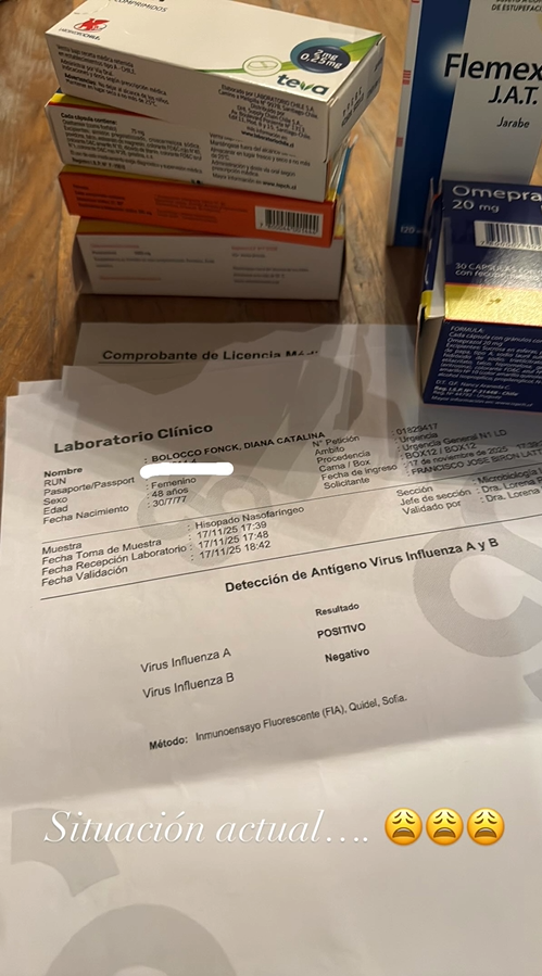 Además, la animadora subió una historia con sus exámenes médicos, que confirmaban el cuadro de influenza.