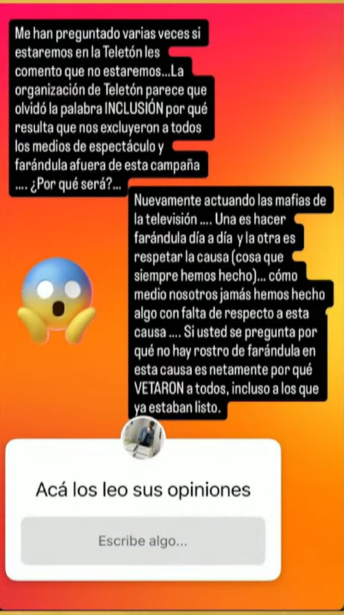 “Me han preguntado varias veces si estaremos en la Teletón, les comento que no estaremos… La organización de Teletón parece que olvidó la palabra INCLUSIÓN porque resulta que nos excluyeron a todos los medios de espectáculo y farándula afuera de esta campaña… ¿Por qué será?”.