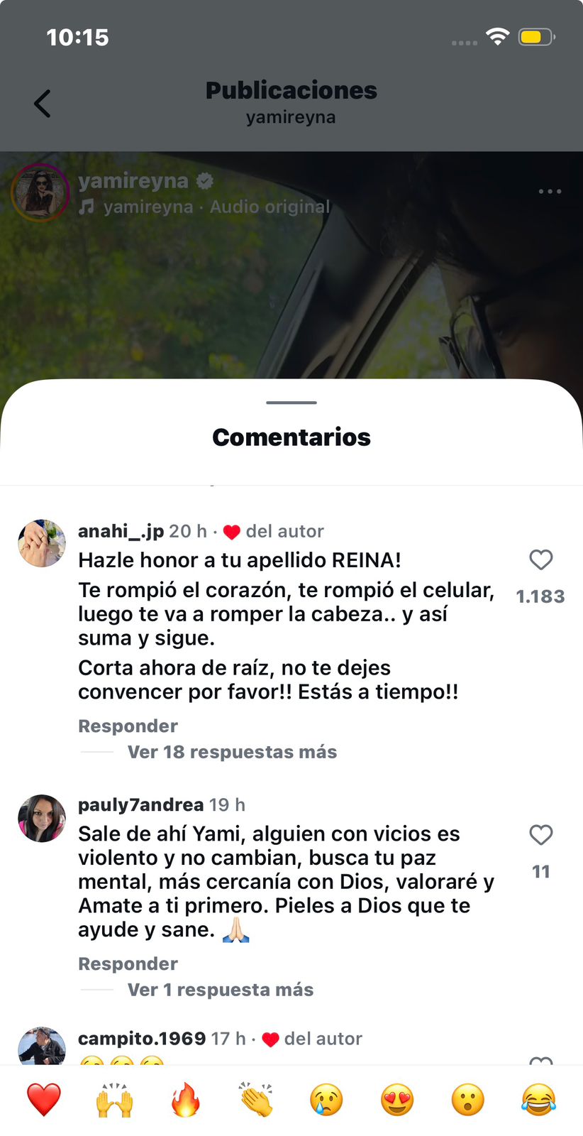 “Hazle honor a tu apellido REINA! Te rompió el corazón, te rompió el celular, luego te va a romper la cabeza.. y así suma y sigue. Corta ahora de raíz, no te dejes convencer por favor!! Estás a tiempo!!”, dice el comentario del usuario anahi_.Jp, al cual Reyna le dio me gusta.