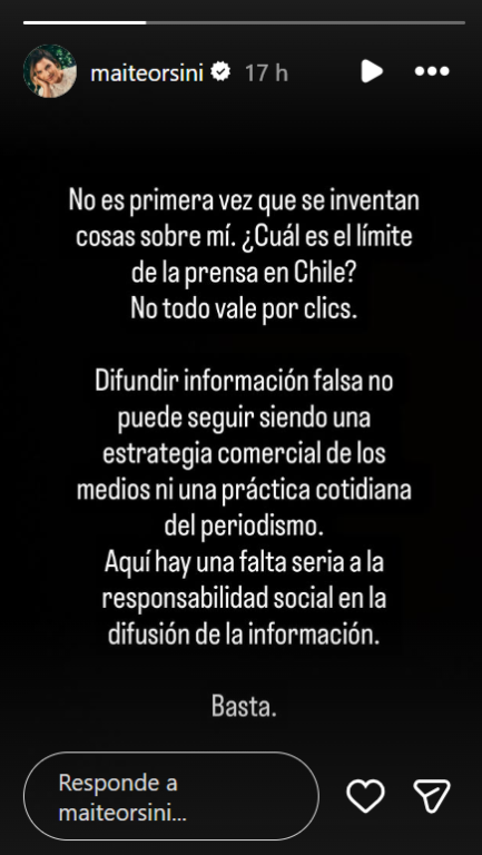 “No es primera vez que se inventan cosas sobre mí. ¿Cuál es el límite de la prensa en Chile? No todo vale por clics”, escribió Orsini en la red social antes mencionada.
