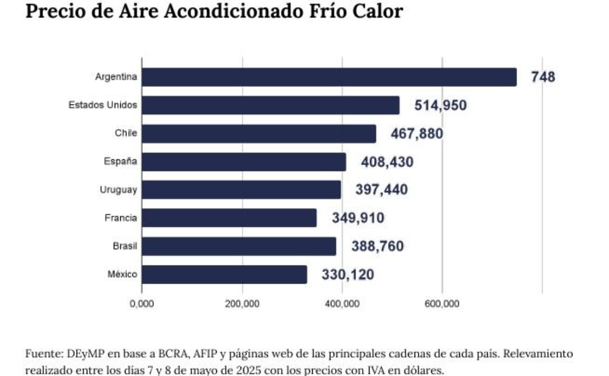 Por último, para el bolsillo de los argentinos, los equipos de aire acondicionado frío/calor son un 37% más baratos en Chile y un 55% más baratos en Brasil y México.