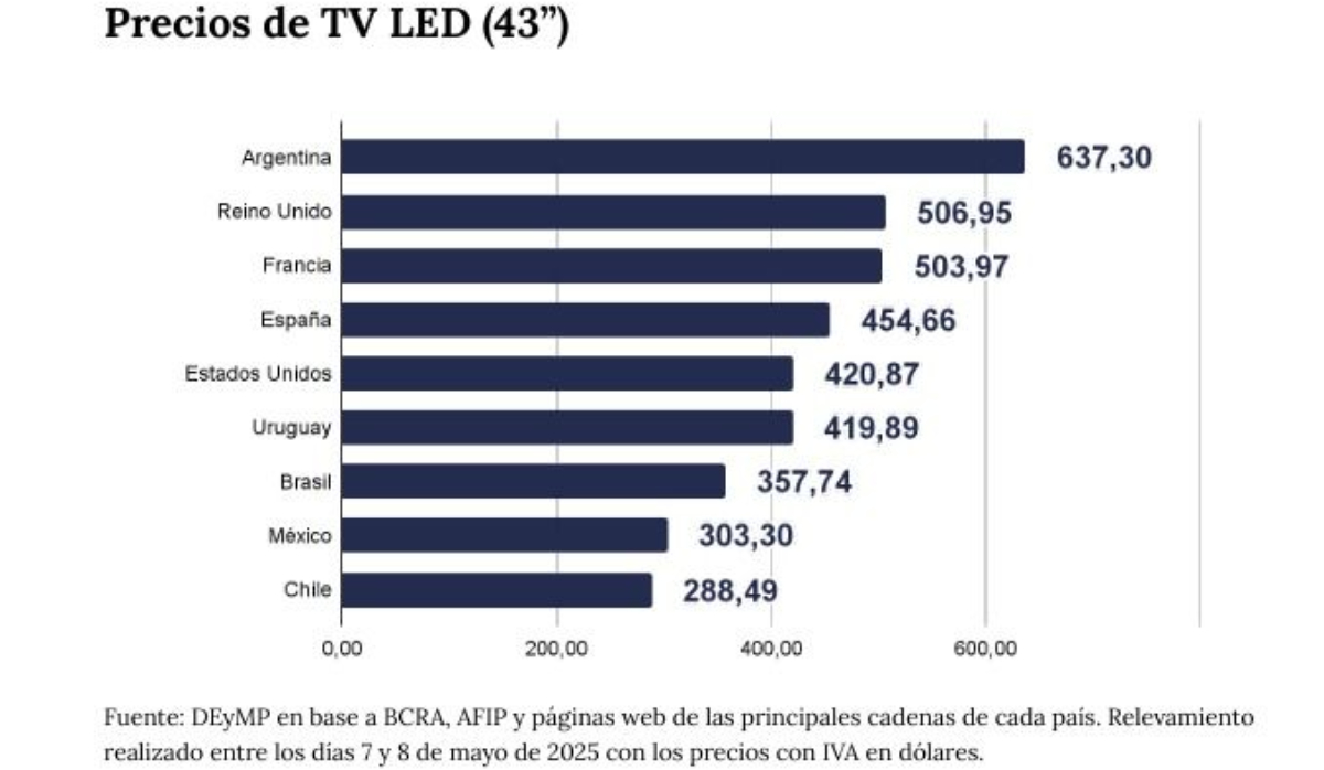 Los precios de las TVs también son más elevados que en el resto del mundo, generando que muchos argentinos elijan comprar estos productos cuando viajan a países vecinos. Por ejemplo, un televisor de primera marca de 43 pulgadas cuesta un 40% menos en Brasil; y 55% menos en México y en Chile.
