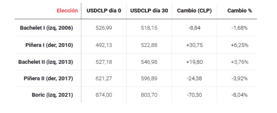 Por su parte, desde XTB realizaron un estudio que reveló que el peso tuvo su mayor apreciación tras el triunfo de Gabriel Boric (8%), mientras que la mayor depreciación fue en la primera victoria de Sebastián Piñera (el dólar subió 6,25%).