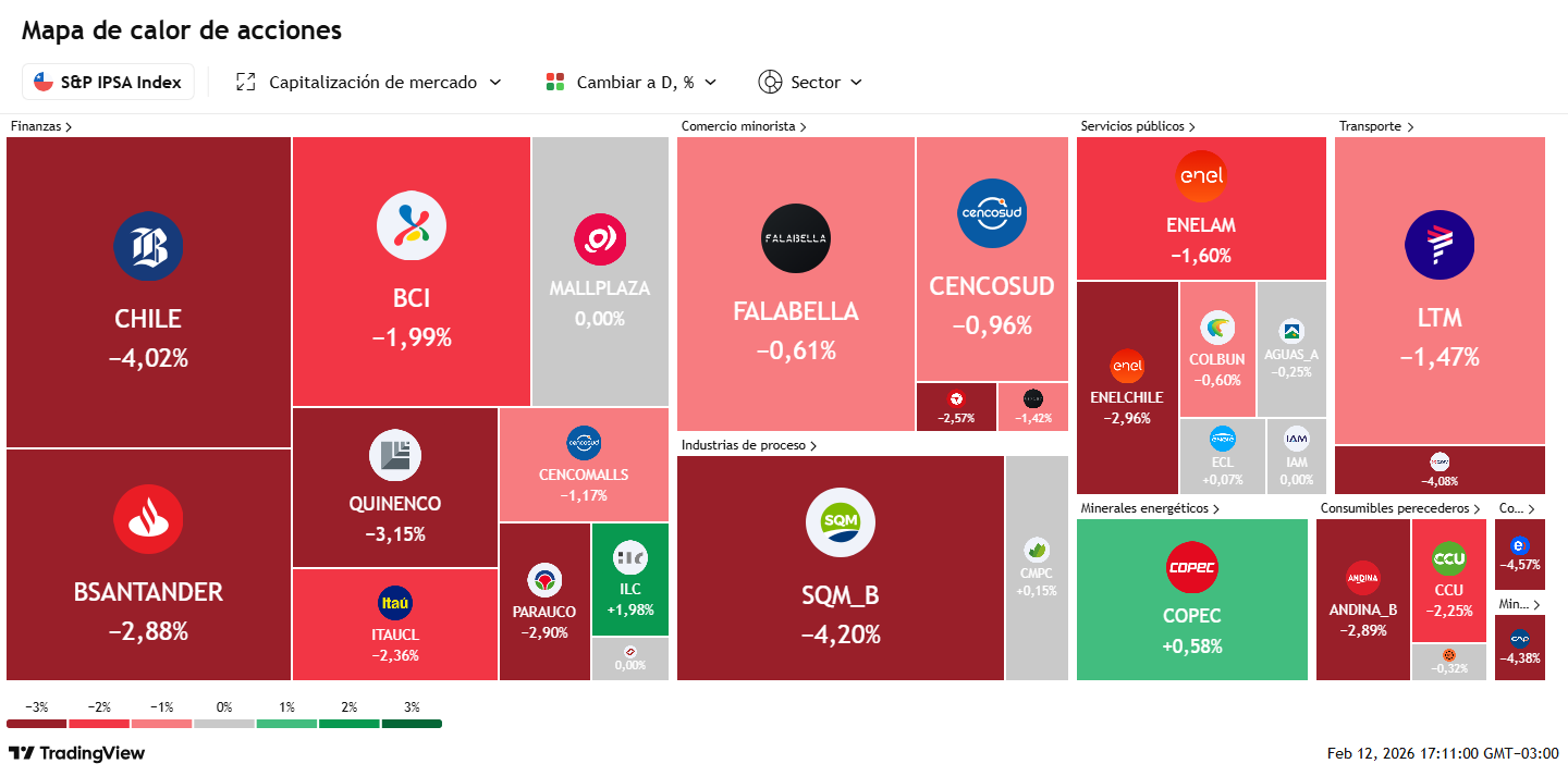 La mayoría de los principales papeles transados en la sesión arrojaron resultados negativos. Latam Airlines, con el mayor volumen de la jornada, cayó un 1,47%, mientras que Banco de Chile y SQM-B registraron salidas más fuertes, con un -4,02% y -4,20% en sus valores.