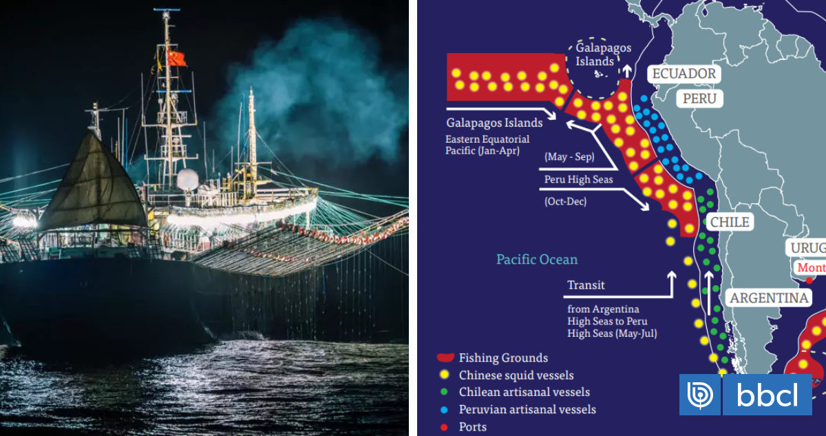 Se trata de la Environmental Justice Foundation (EJF) que lanzó una publicación titulada “Invisible e Impune: La creciente amenaza de la flota potera de China en el Pacífico Sur”, donde se alerta, entre varios aspectos, que hay más de 500 buques chinos en altamar que capturan jibia en el área de la Organización Regional de Ordenación Pesquera del Pacífico Sur (OROP-PS), que incluye el límite de la Zona Económica Exclusiva de Chile.