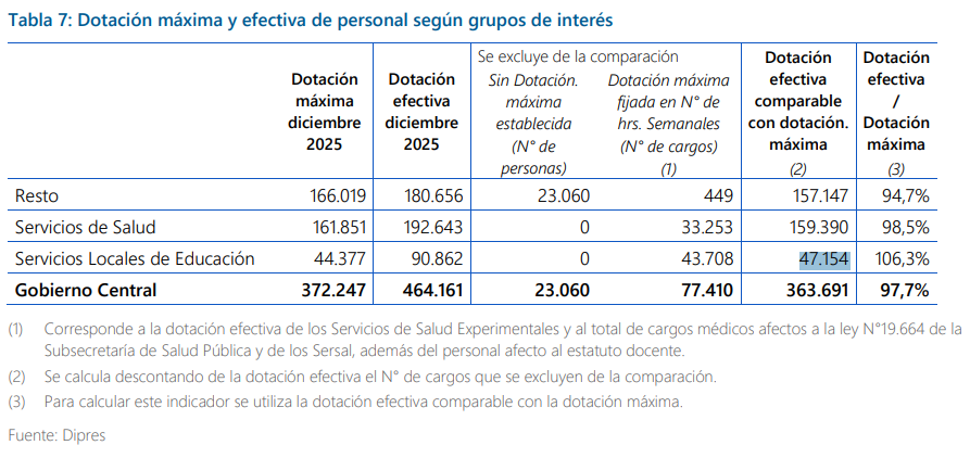 En los servicios de Salud y SLEP, la dotación máxima a diciembre de 2025 estaba establecida en 161.851 y 44.377, respectivamente. Sin embargo, la dotación efectiva comparable con la dotación máxima en este sentido era de 159.390 y 47.154.