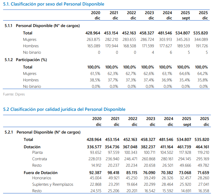 Con ello, se confirmó que a diciembre de 2025, la dotación total del Gobierno Central alcanzó los 535.820 cargos efectivos, un 11,3% más en la comparativa anual, equivalente a 54.274 puestos adicionales.