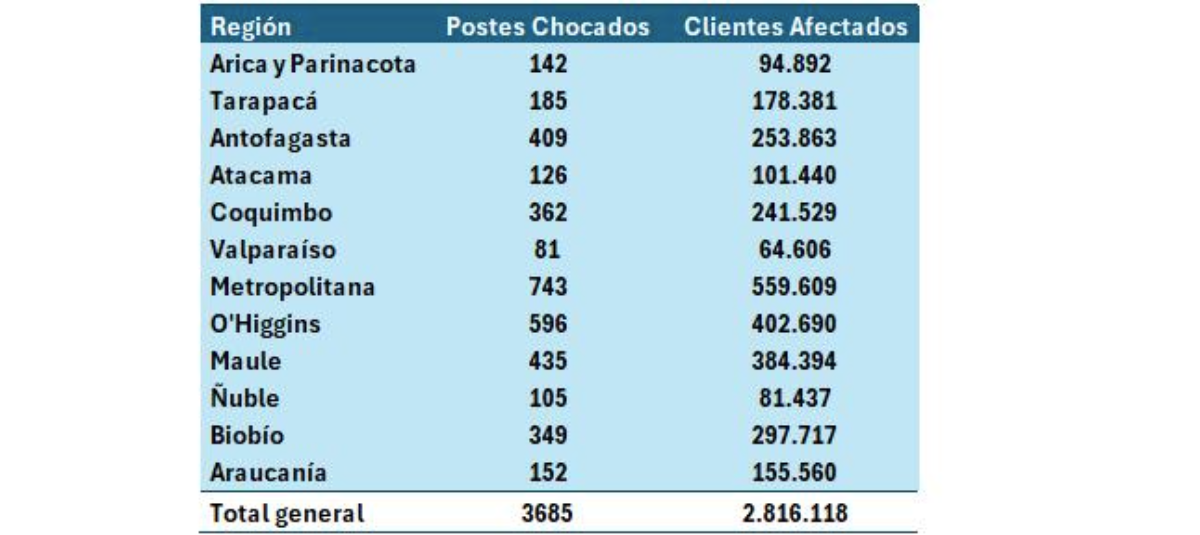 Le sigue la región de O´Higgins, con 402.690 clientes afectados; Maule con 384.394; Bío Bío con 297.717; Antofagasta con 253.863 y Coquimbo con 241.529 clientes afectados en su suministro por postes chocados.