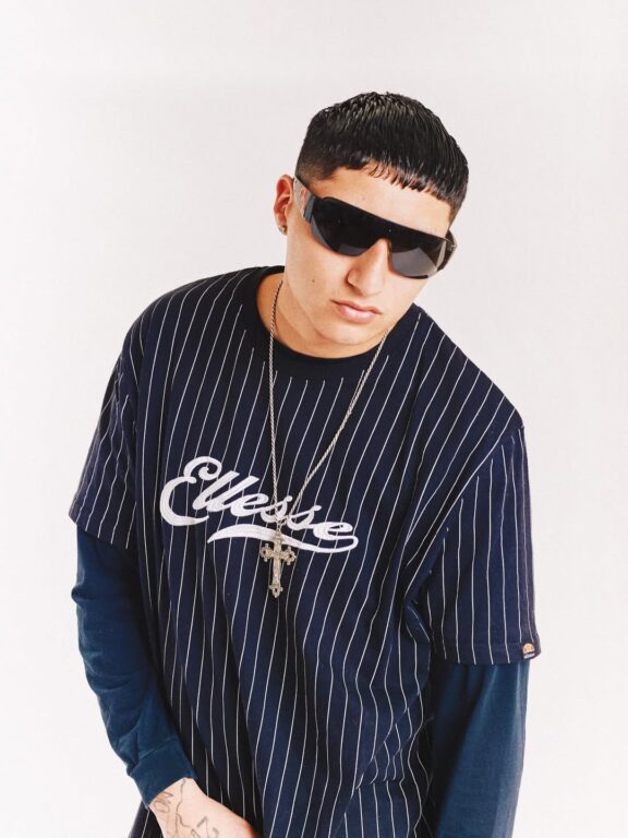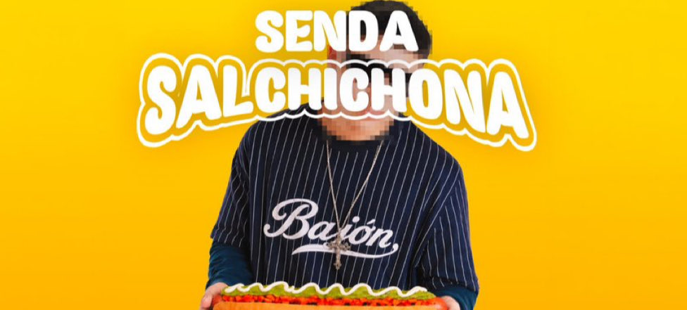 En la gráfica, se observa al artista urbano sosteniendo un completo italiano y vistiendo una prenda con la palabra “bajón“.
