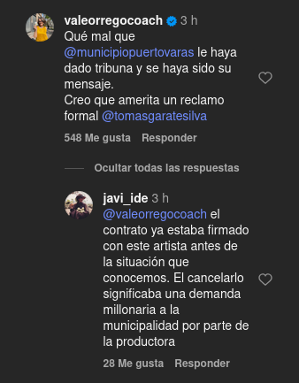 “Le solicitamos formalmente que no se presente, pero la licitación y el contrato de la Semana Puertovarina fue firmado de forma previa a la denuncia y, al no tener herramientas legales para cancelar su presentación, finalmente dependía de él”, comentó Gárate en redes sociales.