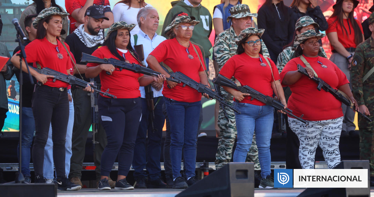 Las mujeres, quienes sostenían sendas armas y portaban franelas rojas alusivas al chavismo, estaban sobre un escenario instalado por el Gobierno en la avenida Bolívar de Caracas, una emblemática vía para el oficialismo donde este martes se concentraron distintos grupos que previamente se movilizaron por la capital en rechazo a las que llaman “amenazas” de EE.UU.