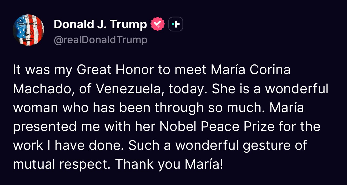 “Fue un gran honor para mí conocer hoy a María Corina Machado, de Venezuela. Es una mujer maravillosa que ha pasado por muchísimo. María me entregó su Premio Nobel de la Paz por el trabajo que he realizado. Un gesto maravilloso de respeto mutuo. ¡Gracias, María!“, escribió el mandatario norteamericano en su cuenta de Truth Social.