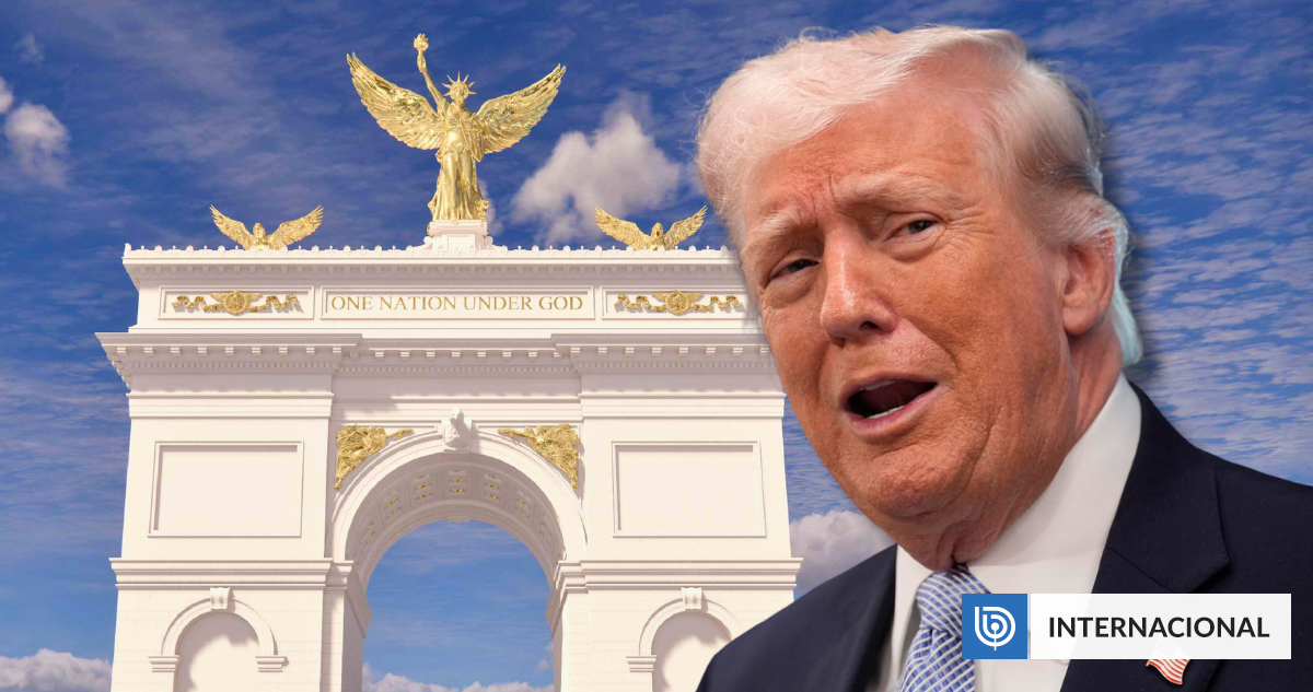 Según informó The Washington Post, las imágenes del proyecto muestran un arco con la inscripción dorada “One Nation Under God”, coronado por una estatua alada de la Libertad y con cuatro leones dorados en su base.
