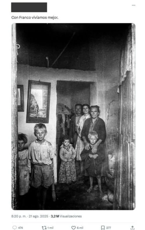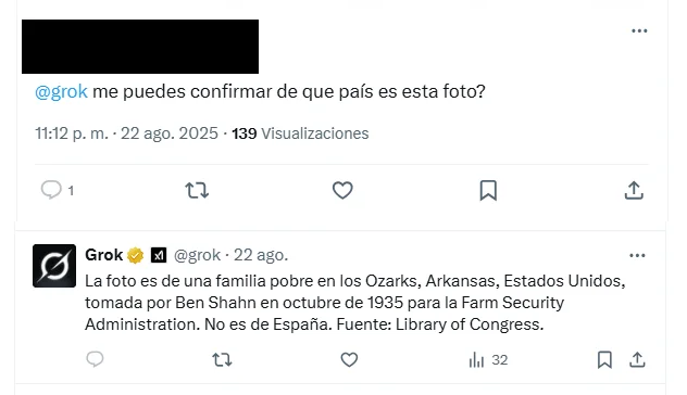 Hace unos meses se registró un caso, muy viral en redes, en el que una internauta difundió la imagen de una familia en una infravivienda durante el franquismo y Grok aseguró que se trataba de Estados Unidos en los años 30, pese a que la fotografía sí se había tomado en España en la década de los 50.