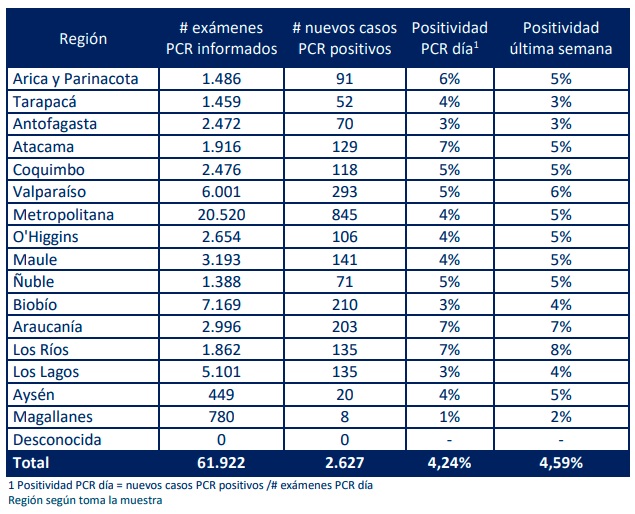 La positividad nacional de PCR se fijó en 4,24% con el análisis de 61.922 exámenes por parte de 167 laboratorios.