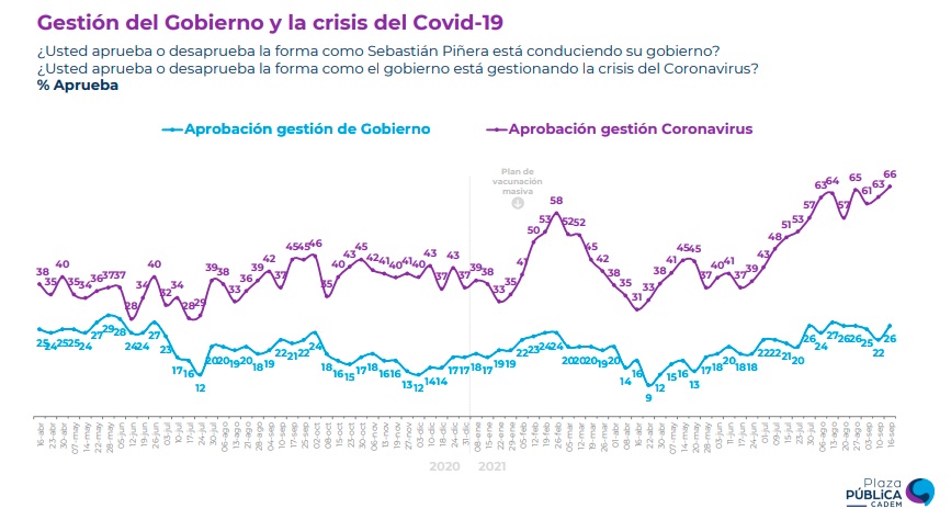 En lo relativo al coronavirus, un 66% de los entrevistados por Cadem dijo aprobar el manejo de la pandemia.