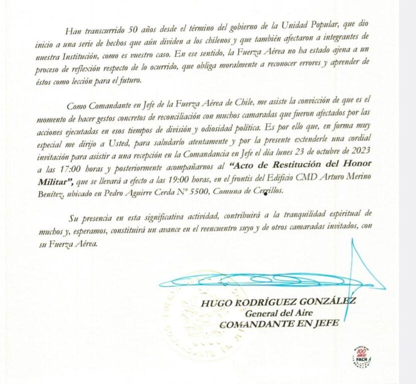 "La Fuerza Aérea no ha estado ajena a un proceso de reflexión respecto de lo ocurrido, que obliga moralmente a reconocer errores y aprender de estos como lección para el futuro", señaló el general Hugo Rodríguez.