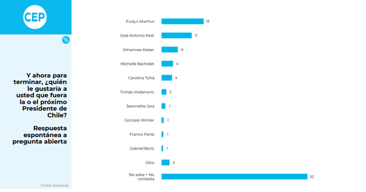 Según la última encuesta del CEP, Evelyn Matthei de Chile Vamos lidera la carrera presidencial con un 15%, seguida por José Antonio Kast con un 11% y Johannes Kaiser con un 6%. Carolina Tohá de Socialismo Democrático y Michelle Bachelet empatan en un 4%. Más atrás se encuentran Tomás Vodanovic con un 2% y varios candidatos con 1%.