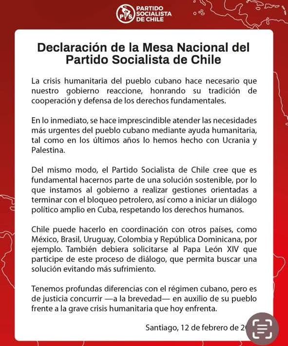 El Partido Socialista respaldó la ayuda humanitaria a Cuba. Pese a sus diferencias con el régimen cubano, el PS considera necesario atender la crisis humanitaria en la isla y aboga por poner fin al bloqueo petrolero, promoviendo un diálogo político amplio y respetuoso de los derechos humanos.